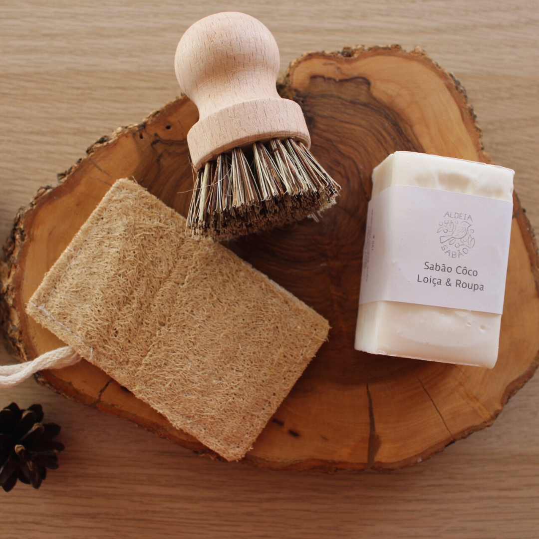 Este conjunto contém um sabão de coco sólido, uma escova para panelas, uma esponja de luffa para a loiça e um saquinho de algodão biológico para compras a granel.