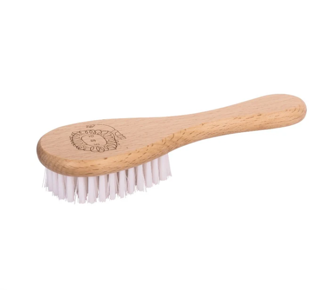 Escova de madeira de faia com cerdas macias especialmente concebida para cuidar suave e confortavelmente do couro cabeludo sensível dos mais novos.