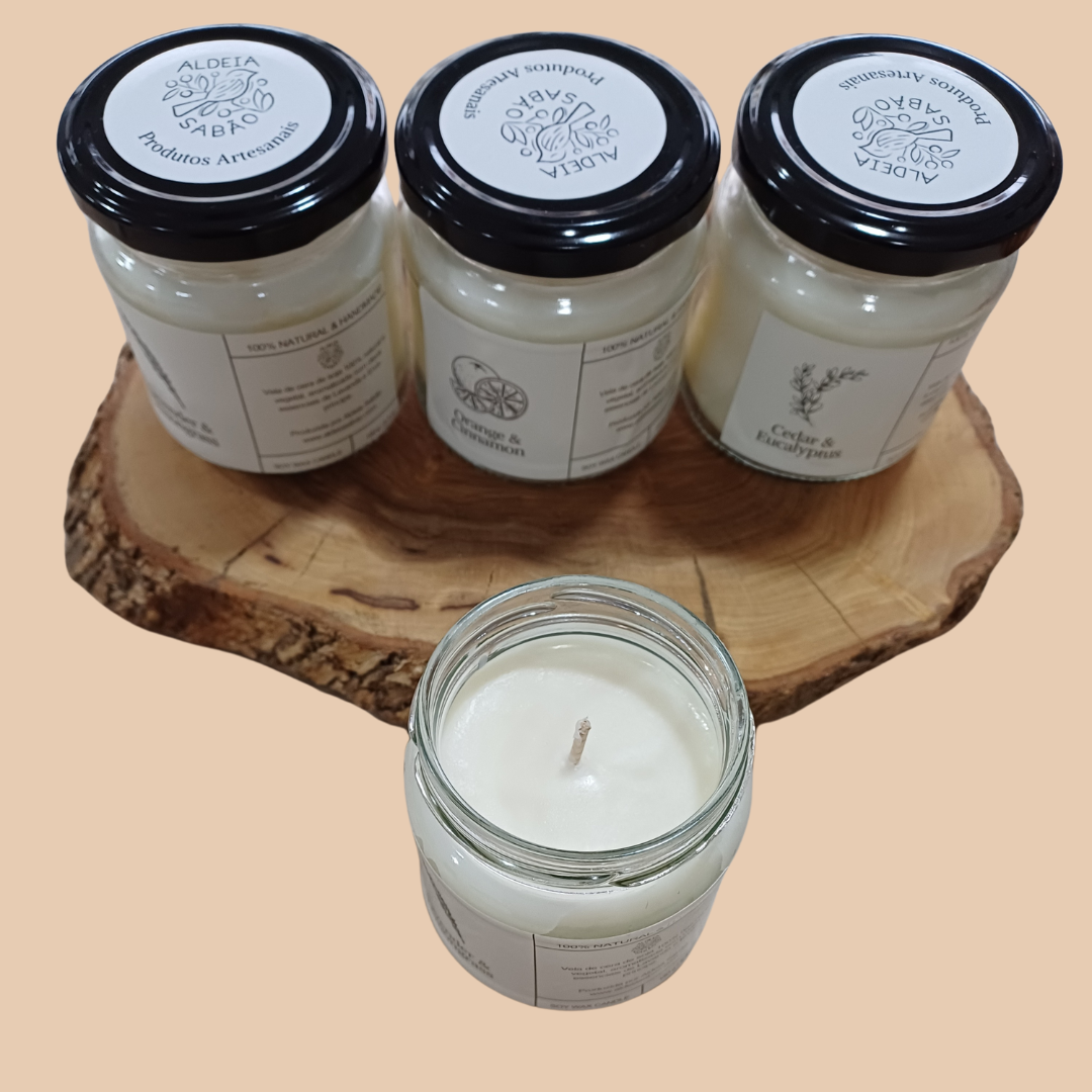 Vela de cera de soja 100% natural, vegetal e artesanal, aromatizada com óleos essenciais biológicos.
